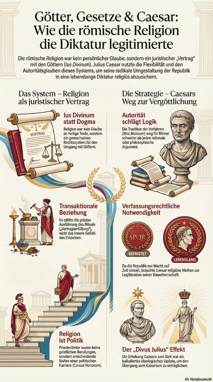 Dieser Audiomitschnitt thematisiert das einzigartige Wesen der römischen Religion und deren entscheidende Rolle bei der Legitimation von Caesars Herrschaft. Im Gegensatz zu modernen Glaubensformen basierte das antike System nicht auf heiligen Schriften, sondern auf einem transaktionalen Rechtsverhältnis zwischen Menschen und Göttern, das strikte Rituale und die Autorität der Vorfahren priorisierte. Die Sprecher erläutern, wie Religion und Politik untrennbar verwoben waren, wodurch geistliche Ämter zu strategischen Instrumenten im machtpolitischen Wettbewerb wurden. Vor diesem Hintergrund wird Caesars Selbsterhebung zum Gott nicht als bloßer Größenwahn, sondern als notwendige ideologische Innovation zur Festigung seiner Alleinherrschaft interpretiert. Letztlich dient die Analyse dazu, die religiöse Transformation Roms als das fundamentale Fundament für den Übergang von der Republik zum Kaiserreich zu verstehen.